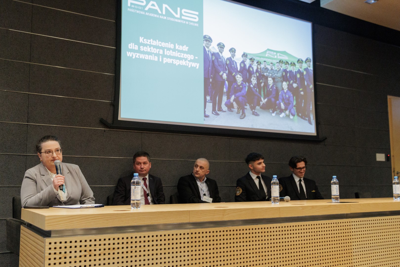 Rektor Beata Fałda poprowadziła panel dyskusyjny pt. „Kształcenie kadr dla sektora lotniczego – wyzwania i perspektywy”. W dyskusji wzięli również udział: menedżer sektora lotniczego Tomasz Pawełek, dyrektor Centrum Lotniczego PANS w Chełmie Łukasz Puzio oraz studenci Uczelni – Jakub Mokrzak i Kamil Tynka.